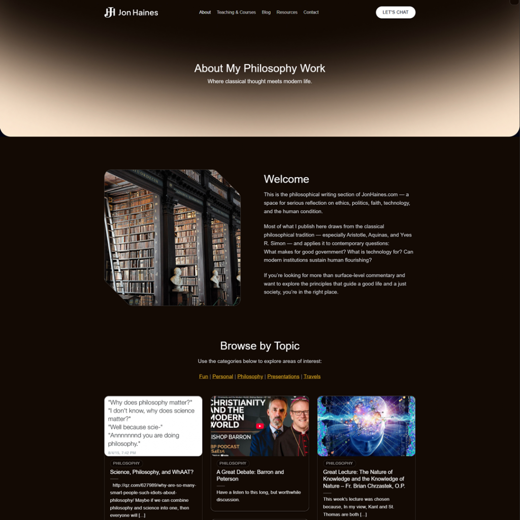 Cohesive Branding Across Sections: Using a single theme for both the cybersecurity and philosophy sections allowed us to enforce a consistent branding and navigation structure. This design consistency reinforces Jon’s personal brand across all his content.