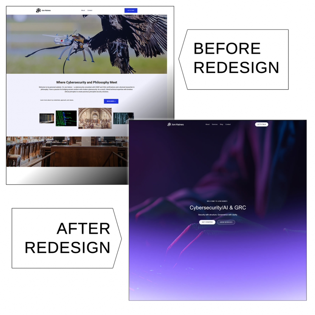 Inconsistent Branding: Jon’s site is essentially split into two sections – cybersecurity and philosophy – but the branding and design between them weren’t consistent. We needed a unified design language that still allowed each specialty to have its own identity.